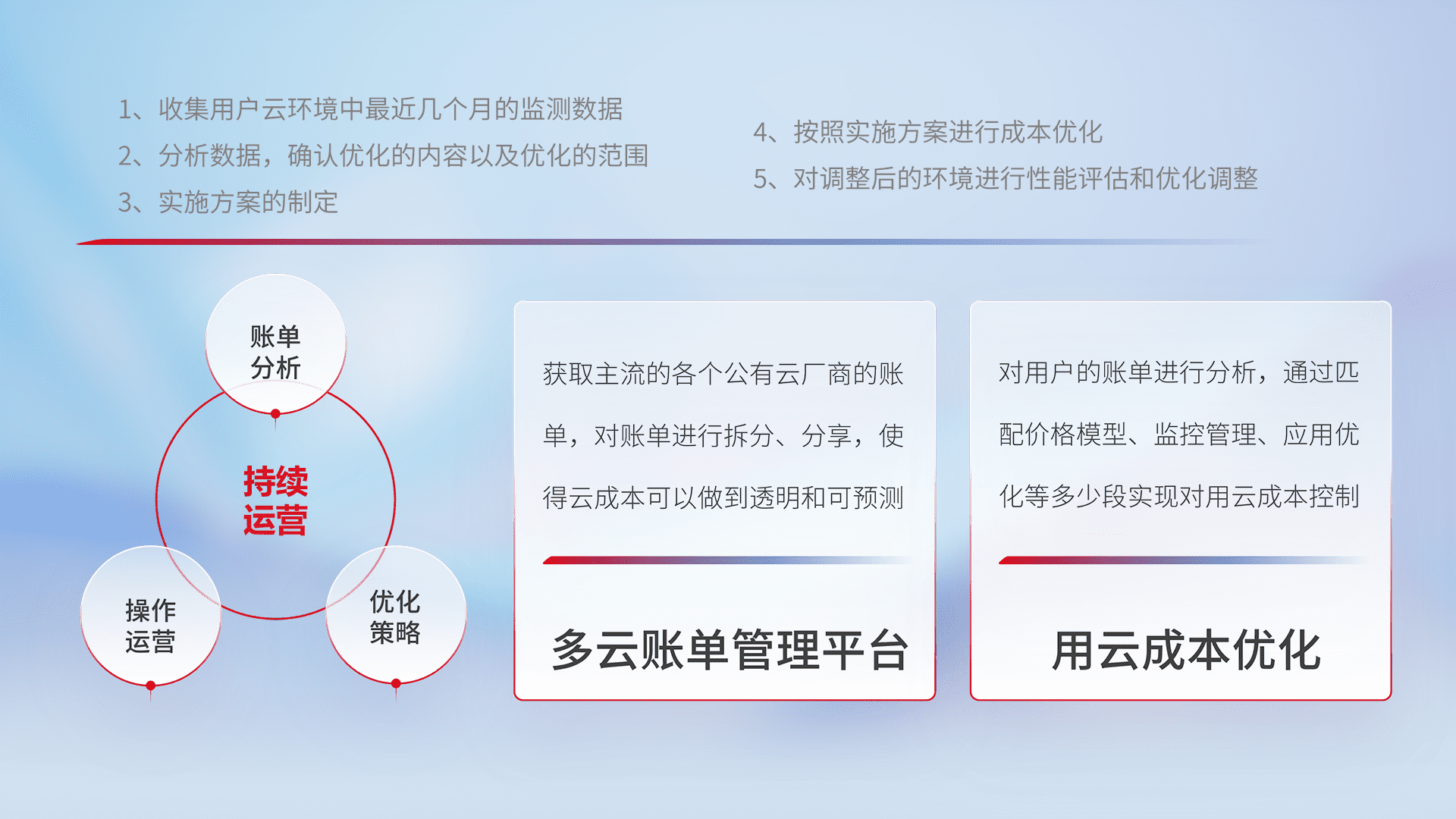 通过多云纳管,,以统一的资源数据模型把客户的云资源进行抽象和封装,,,,进而实现对多云资源的统一操作,,,保障云资源管理的可靠性、、、稳定性与可用性。。。量身定制化运维内容,,,配置、、开发运维、、补丁管理、、、备份、、、监控、、认证和访问管理、、审计和日常巡检等,,保障在用云过程中的可靠度,,,稳定度以及高可用率。。。